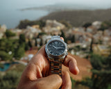 Dial details - Ocean blue dial, with silver sub-dials, markers,& hands.
